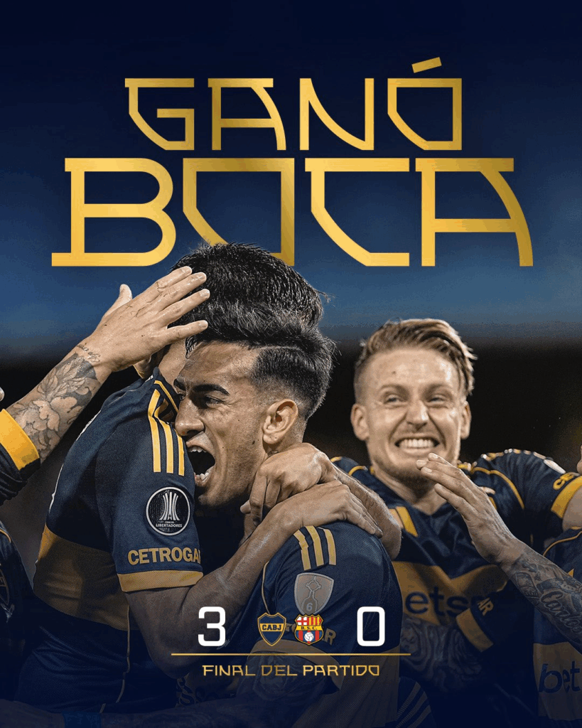 De esta manera terminó el partido con esta victoria cómoda 3-0 de Boca Juniors ante Barcelona. Los argentinos son punteros con puntaje ideal de 6, seguido por los 3 de Cruzeiro y lo sigue Barcelona y Universidad Católica cada uno con 0 puntos. Recordemos que mañana los cruzados se miden ante los brasileños a las 18:00 horas.