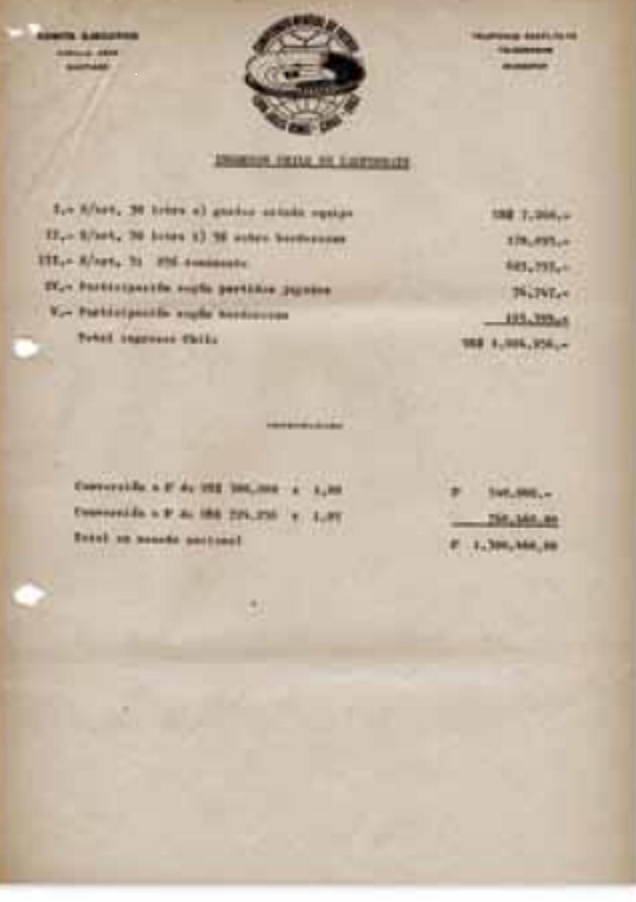 esto fue un elemento importante para que las utilidades del torneo fueran tan interesantes. (Nota del editor: Según documentos oficiales de la época, con membrete del Comité Ejecutivo, los ingresos totales fueron de US$ 3.852.567.68 y los gastos sumaron US$ 1.298.936.17, con un saldo favorable de US$ 2.553.631.51. El reparto fue de un 10% para la FIFA (US$ 255.363.15); un 25% para la Federación chilena